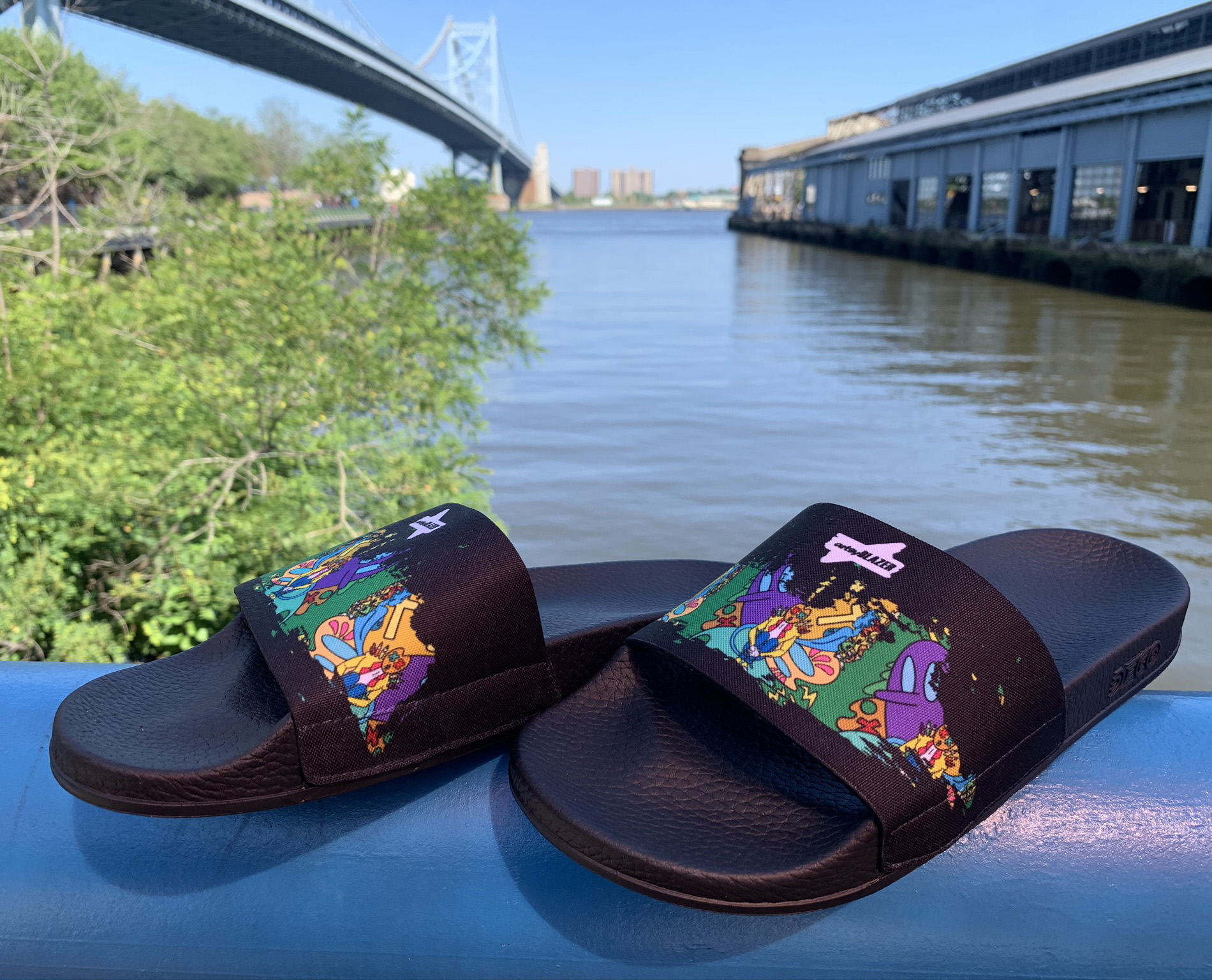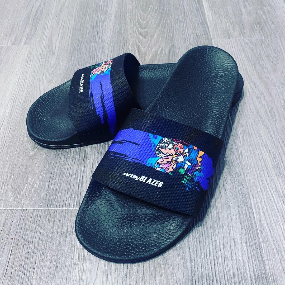 ArtsyBlazer in collaboration with Deco Slides are the only custom slides sandals with a full area transfer, meaning designs can occupy the full height and width of the sandal strap. Because we transfer artwork via dye sublimation.