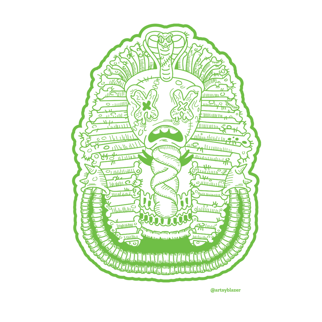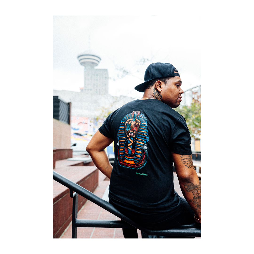 GreenPlanet and ArtsyBlazer collaboration promotional shirts featuring Mista Pharaoh artwork. Print methods are screen print and Direct to Garment (DTG).