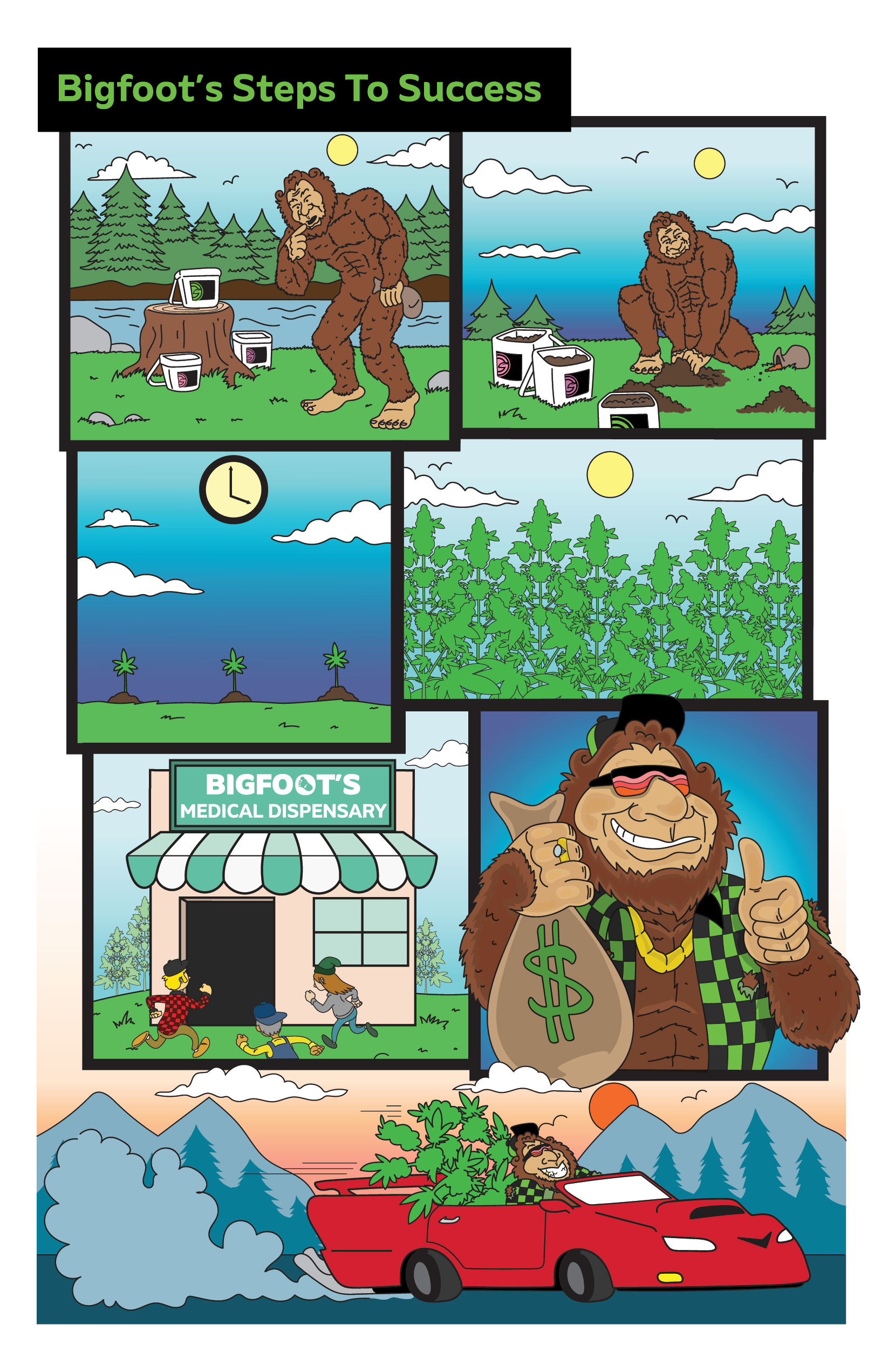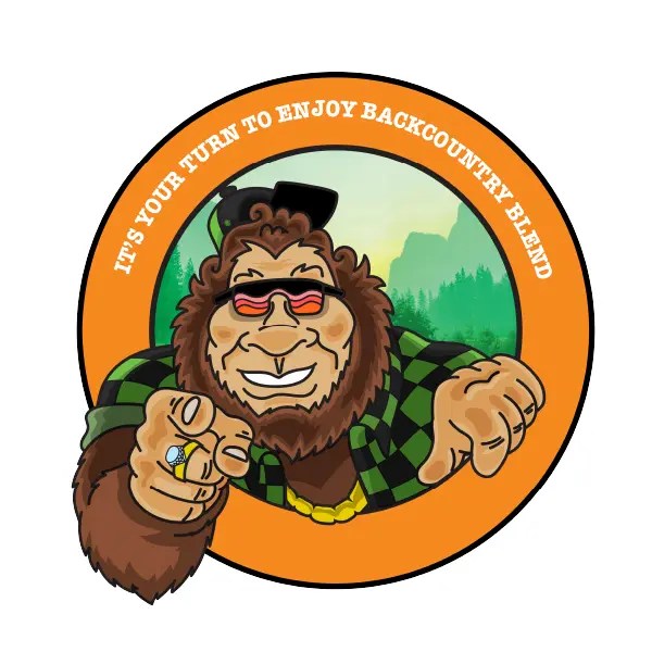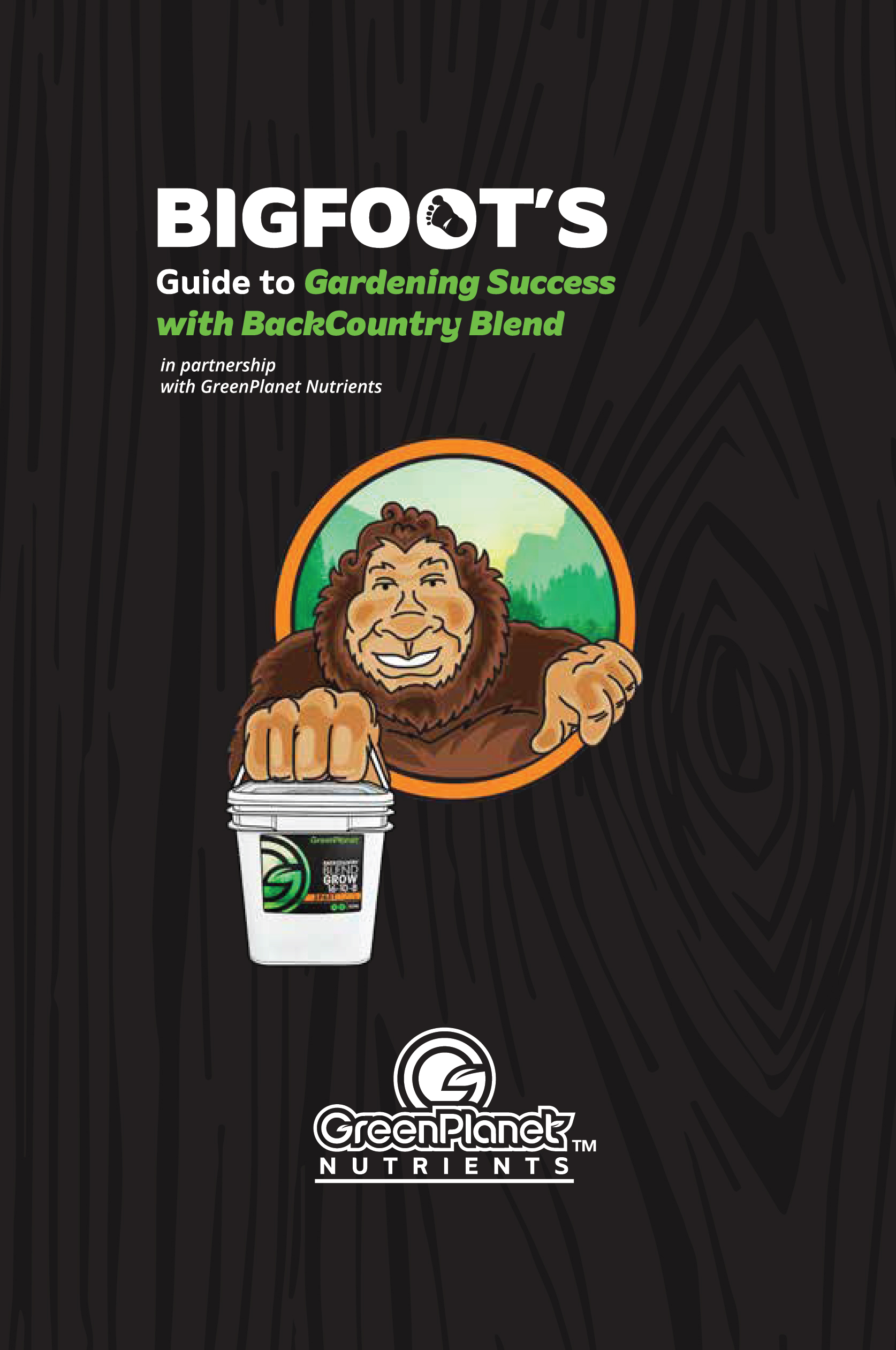 Illustrated BigFoot character design used to promote GreenPlanet Nutrients Backcountry Blend, a granular base nutrient. Printable materials include stickers, educational material, and labels.